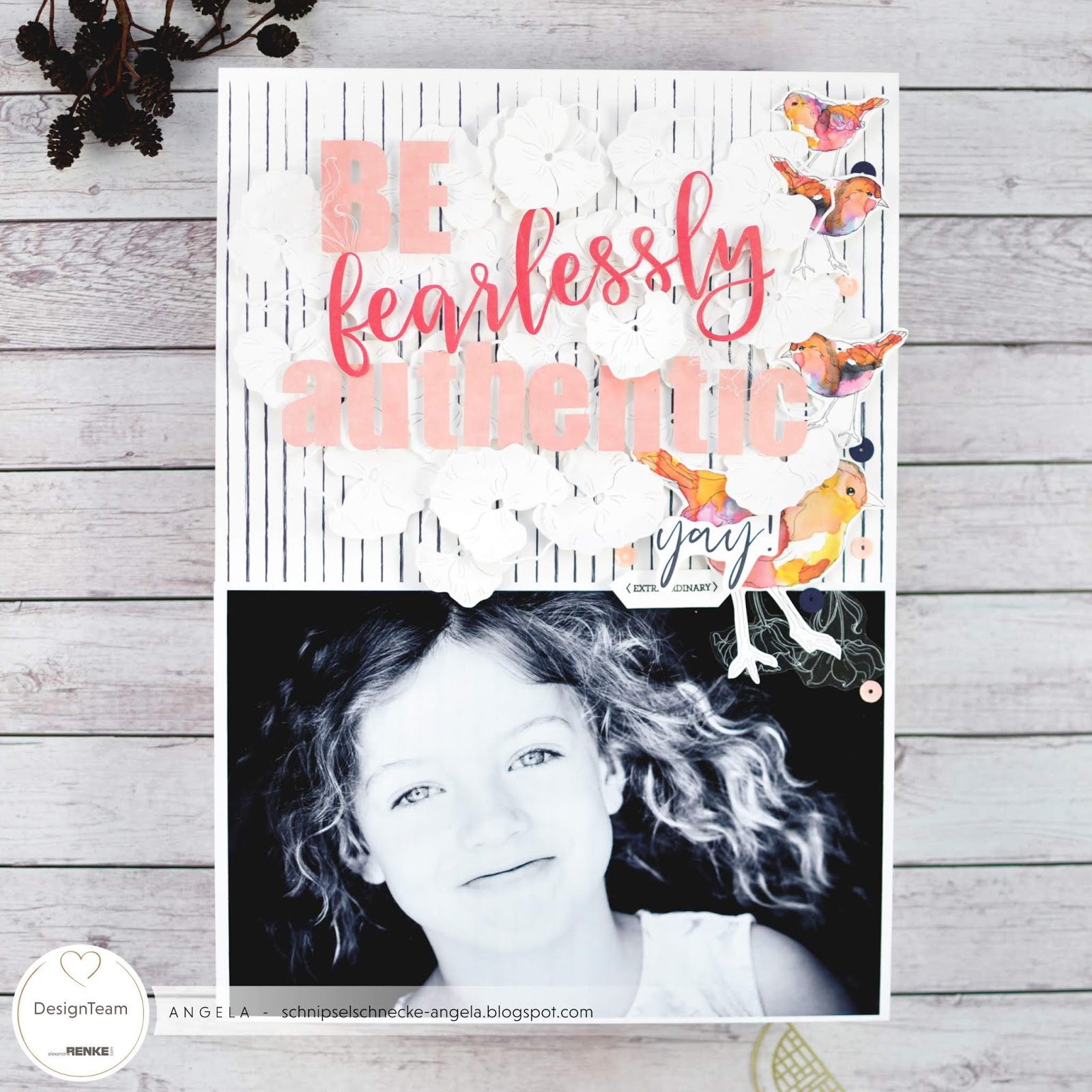 Die süßen Vögelchen von Alexandra Renke sind heute auf meinem Layout gelandet. Mit der tollen Stiefmütterchen Stanze im Hintergrund. Leider ist sie gerade ausverkauft aber sie wird bald wieder im Shop sein, habt etwas Geduld. 🙂